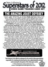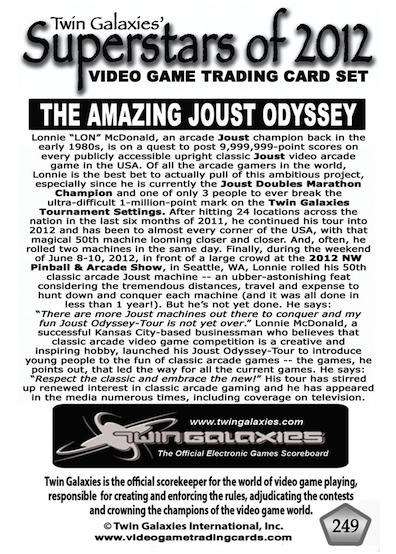 The Joust Odyssey card #249 is part of the LONNIE McDONALD JOUST HISTORY SERIES of cards sponsored by Lonnie McDonald, of Kansas City, MO.