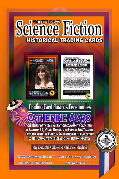 Catherine Asaro was born in Oakland and grew up in El Cerrito, California. She has a B.S. with highest honors in chemistry from UCLA, an M.A. in physics from Harvard, and a PhD in theoretical chemical physics, also from Harvard. Her critically acclaimed work spans the genres of science fiction, fantasy and near future thrillers, with more than 25 novels and many shorter works. She is best known for her Ruby Dynasty series, about which Roland Green of Booklist says the “saga is now nearly as long and in many ways as compelling as Dune, if not more so, featuring a multitude of stronger female characters.” Her work has won numerous awards, including the Nebula for her book the Quantum Rose and her novella "The Spacetime Pool." When not writing or making appearances at conventions, Asaro directs the Chesapeake Math Program. Her nationally ranked students have placed at the top levels in numerous national and international competitions such as the USA Mathematical Olympiad, the Harvard-MIT Math Tournament, and American Regions Math League. She also performs as a vocalist at cons and other venues. This trading card was presented to Guest of Honor Catherine Asaro at Balticon 52, in Baltimore, Maryland, May 25, 2018.