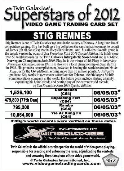 Other Notes: This is the standard card for Stig Remnes, which has been written in English. Stig's companion card -352A - has the backside text translated into Norwegian and is a limited run card with only 275 copies produced.
