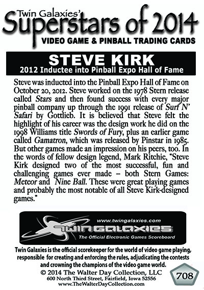 Steve was inducted into the Pinball Expo Hall of Fame on October 20, 2012. Steve worked on the 1978 Stern release called Stars and then found success with every major pinball company up through the 1991 release of Surf N’ Safari by Gottlieb. It is believed that Steve felt the highlight of his career was the design work he did on the 1998 Williams title Swords of Fury, plus an earlier game called Gamatron, which was released by Pinstar in 1985. But other games made an impression on his peers, too. In the words of fellow design legend, Mark Ritchie, “Steve Kirk designed two of the most successful, fun and challenging games ever made -- both Stern Games: Meteor and Nine Ball. These were great playing games and probably the most notable of all Steve Kirk-designed games.”