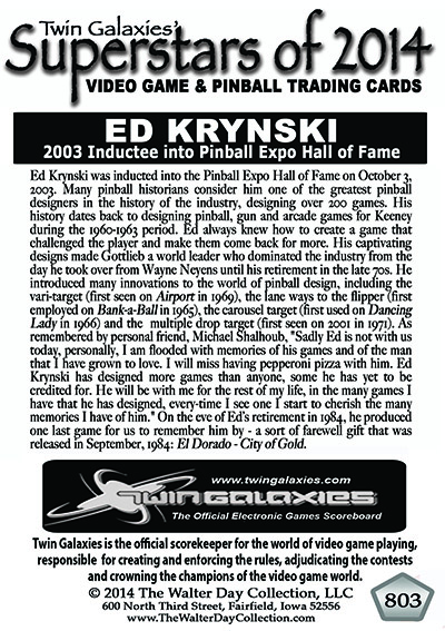 Ed Krynski was inducted into the Pinball Expo Hall of Fame on October 3, 2003. Many pinball historians consider him one of the greatest pinball designers in the history of the industry, designing over 200 games. His history dates back to designing pinball, gun and arcade games for Keeney during the 1960-1963 period. Ed always knew how to create a game that challenged the player and make them come back for more. His captivating designs made Gottlieb a world leader who dominated the industry from the day he took over from Wayne Neyens until his retirement in the late 70s. He introduced many innovations to the world of pinball design, including the vari-target (first seen on Airport in 1969), the lane ways to the flipper (first employed on Bank-a-Ball in 1965), the carousel target (first used on Dancing Lady in 1966) and the multiple drop target (first seen on 2001 in 1971). As remembered by personal friend, Michael Shalhoub, "Sadly Ed is not with us today, personally, I am flooded with memories of his games and of the man that I have grown to love. I will miss having pepperoni pizza with him. Ed Krynski has designed more games than anyone, some he has yet to be credited for. He will be with me for the rest of my life, in the many games I have that he has designed, every-time I see one I start to cherish the many memories I have of him." On the eve of Ed’s retirement in 1984, he produced one last game for us to remember him by - a sort of farewell gift that was released in September, 1984: El Dorado - City of Gold.