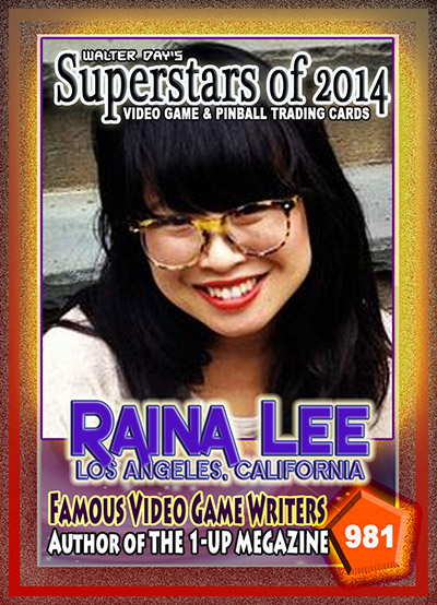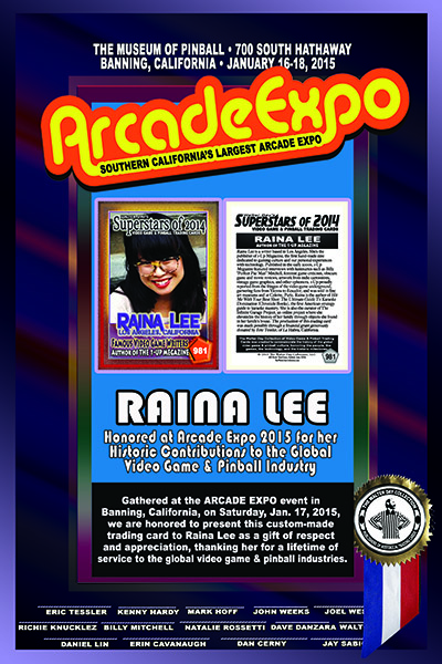 This award was presented to Raina Lee at the Official Walter Day Trading Card Museum, at the amazing John Week's Museum of Pinball, in Banning, California, January 17, 2015.