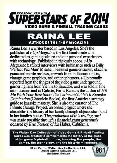 Raina Lee is a writer based in Los Angeles. She’s the publisher of 1-Up Megazine, the first hand-made zine dedicated to gaming culture and our personal experiences with technology. Published in the early 2000s, 1-Up Megazine featured interviews with luminaries such as Billy “Perfect Pac Man” Mitchell, feminist game criticism, obscure game and movie reviews, artwork from indie cartoonists, vintage game graphics, and other ephemera. 1-Up proudly reported from the fringes of the video game underground, garnering fans from Vienna to Ecuador, and was sold in fine art museums and at Colette, Paris. Raina is the author of Hit Me With Your Best Shot: The Ultimate Guide To Karaoke Domination (Chronicle Books), the first American strategy guide to karaoke mastery. She is also the curator of The Infinite Garage Project, an online project where she chronicles the history of her family through objects she found in her family’s house. The production of this trading card was made possible through a financial grant generously donated by Eric Tessler, of La Habra, California.