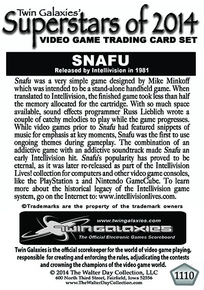 This Snafu trading card is part of a collection of 21 different Intellivision Trading Cards that were officially authorized by Keith Robinson of Intellivision. Click on this link to see the entire set: