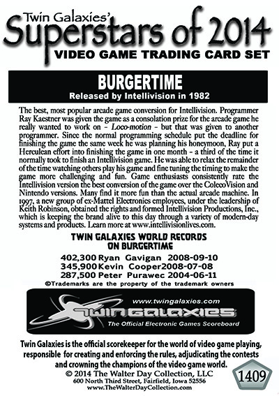 This BurgerTime trading card is part of a collection of 21 different Intellivision Trading Cards that were officially authorized by Keith Robinson of Intellivision. Click on this link to see the entire set: