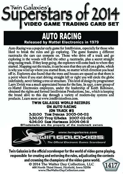 This Auto Racing trading card is part of a collection of 21 different Intellivision Trading Cards that were officially authorized by Keith Robinson of Intellivision. Click on this link to see the entire set: