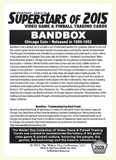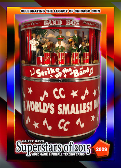 This card was sponsored by Eric Tessler, of La Habra, California. The card was unveiled during the Arcade Expo, at the Museum of Pinball, in Banning, California, January 17, 2015. Brad Frank Restorations—the official copyright holder of all Chicago Coin intellectual property—graciously granted the Walter Day Collection permission to use Chicago Coin intellectual property in making this card. To learn more of Brad Frank's work in keeping the legacy of Chicago Coin alive, go to: http://www.bradfrankrestorations.com/