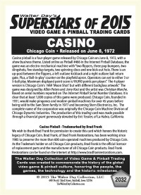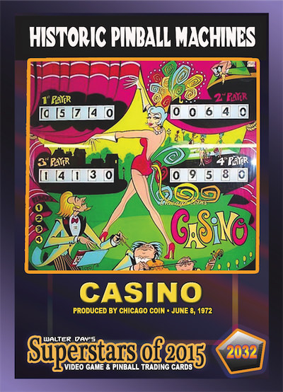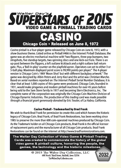 This card was sponsored by Eric Tessler, of La Habra, California. The card was unveiled during the Arcade Expo, at the Museum of Pinball, in Banning, California, January 17, 2015. Brad Frank Restorations—the official copyright holder of all Chicago Coin intellectual property—graciously granted the Walter Day Collection permission to use Chicago Coin intellectual property in making this card. To learn more of Brad Frank's work in keeping the legacy of Chicago Coin alive, go to: http://www.bradfrankrestorations.com/