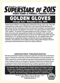 This card was sponsored by Eric Tessler, of La Habra, California. The card was unveiled during the Arcade Expo, at the Museum of Pinball, in Banning, California, January 17, 2015. Brad Frank Restorations—the official copyright holder of all Chicago Coin intellectual property—graciously granted the Walter Day Collection permission to use Chicago Coin intellectual property in making this card. To learn more of Brad Frank's work in keeping the legacy of Chicago Coin alive, go to: http://www.bradfrankrestorations.com/