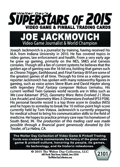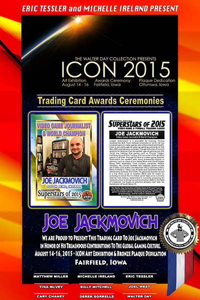 This card was sponsored by Eric Tessler, of La Habra, California. The award was presented at the ICON 2015 event in Fairfield, Iowa, August 15, 2015. The card was issued at the Twin Galaxies Entertainment Festival, in Banning, California, October 3, 2015.