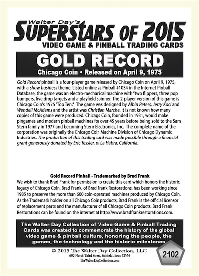 This card was sponsored by Eric Tessler, of La Habra, California. The card was unveiled during the Arcade Expo, at the Museum of Pinball, in Banning, California, January 17, 2015. Brad Frank Restorations—the official copyright holder of all Chicago Coin intellectual property—graciously granted the Walter Day Collection permission to use Chicago Coin intellectual property in making this card. To learn more of Brad Frank's work in keeping the legacy of Chicago Coin alive, go to: http://www.bradfrankrestorations.com/