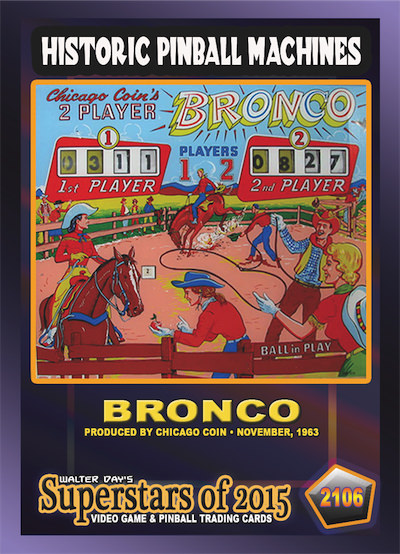 This card was sponsored by Eric Tessler, of La Habra, California. The card was unveiled during the Arcade Expo, at the Museum of Pinball, in Banning, California, January 17, 2015. Brad Frank Restorations—the official copyright holder of all Chicago Coin intellectual property—graciously granted the Walter Day Collection permission to use Chicago Coin intellectual property in making this card. To learn more of Brad Frank's work in keeping the legacy of Chicago Coin alive, go to: http://www.bradfrankrestorations.com/
