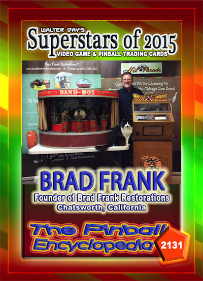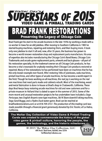 This card was sponsored by Eric Tessler, of La Habra, California. The card was unveiled during the Arcade Expo, at the Museum of Pinball, in Banning, California, January 17, 2015. Brad Frank Restorations—the official copyright holder of all Chicago Coin intellectual property—graciously granted the Walter Day Collection permission to use Chicago Coin intellectual property in making this card. To learn more of Brad Frank's work in keeping the legacy of Chicago Coin alive, go to: http://www.bradfrankrestorations.com/