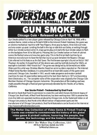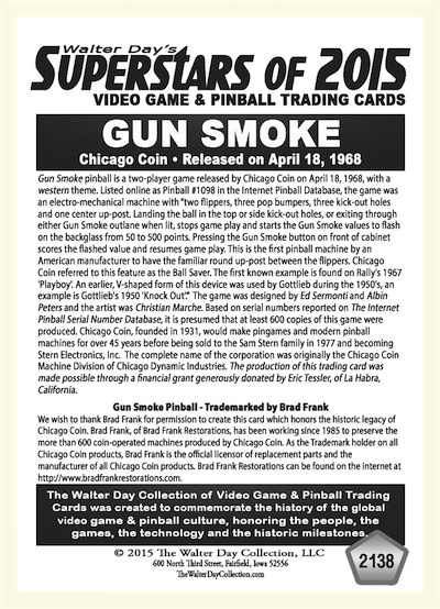 This card was sponsored by Eric Tessler, of La Habra, California. The card was unveiled during the Arcade Expo, at the Museum of Pinball, in Banning, California, January 17, 2015. Brad Frank Restorations—the official copyright holder of all Chicago Coin intellectual property—graciously granted the Walter Day Collection permission to use Chicago Coin intellectual property in making this card. To learn more of Brad Frank's work in keeping the legacy of Chicago Coin alive, go to: http://www.bradfrankrestorations.com/