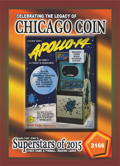 This card was sponsored by Eric Tessler, of La Habra, California. The card was unveiled during the Arcade Expo, at the Museum of Pinball, in Banning, California, January 17, 2015. Brad Frank Restorations—the official copyright holder of all Chicago Coin intellectual property—graciously granted the Walter Day Collection permission to use Chicago Coin intellectual property in making this card. To learn more of Brad Frank's work in keeping the legacy of Chicago Coin alive, go to: http://www.bradfrankrestorations.com/