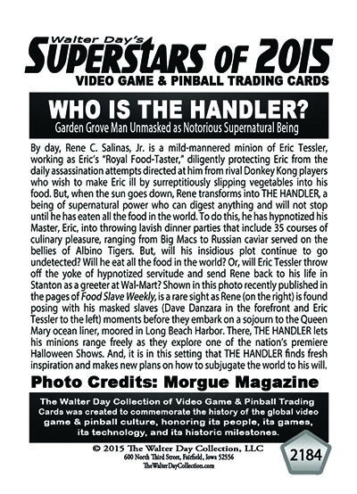 This card was sponsored by Eric Tessler, of La Habra, California. The award and card were presented during the Twin Galaxies Entertainment Festival, at the Museum of Pinball, in Banning, California, October 3, 2015.