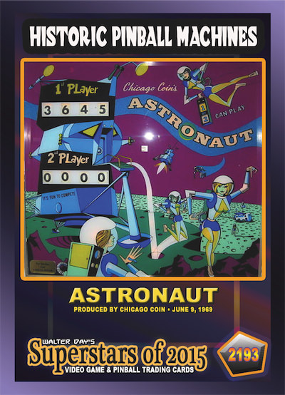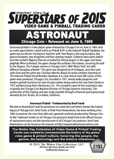 This card was sponsored by Eric Tessler, of La Habra, California. The card was unveiled during the Arcade Expo, at the Museum of Pinball, in Banning, California, January 17, 2015. Brad Frank Restorations—the official copyright holder of all Chicago Coin intellectual property—graciously granted the Walter Day Collection permission to use Chicago Coin intellectual property in making this card. To learn more of Brad Frank's work in keeping the legacy of Chicago Coin alive, go to: http://www.bradfrankrestorations.com/