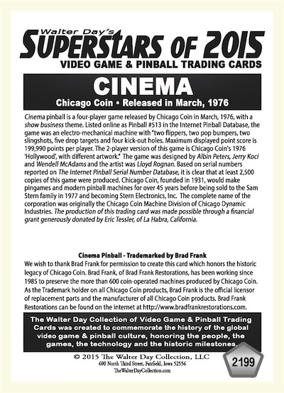 Other Notes: This card was sponsored by Eric Tessler, of La Habra, California. The card was unveiled during the Arcade Expo, at the Museum of Pinball, in Banning, California, January 17, 2015. Brad Frank Restorations—the official copyright holder of all Chicago Coin intellectual property—graciously granted the Walter Day Collection permission to use Chicago Coin intellectual property in making this card. To learn more of Brad Frank's work in keeping the legacy of Chicago Coin alive, go to: