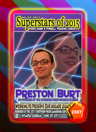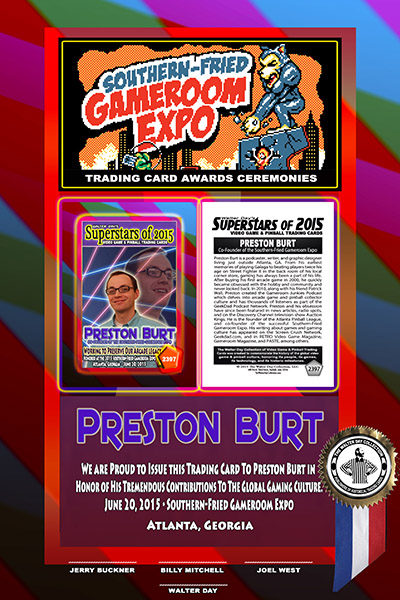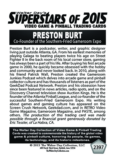 Card sponsored by Eric Tessler, of La Habra, California. Card created for 2015 Southern Fried Gameroom Expo but issued at the Twin Galaxies Entertainment Festival, in Banning, California, October 3, 2015.