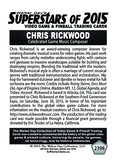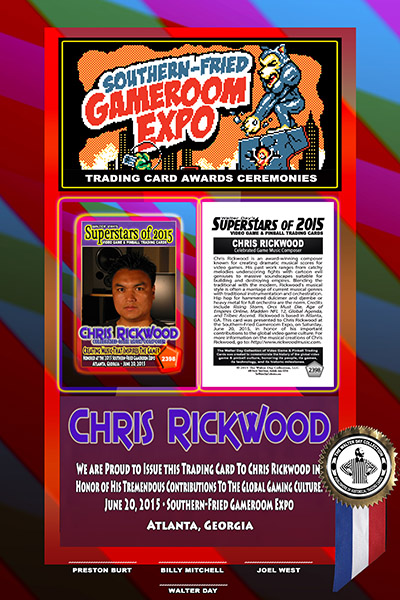 Card sponsored by Eric Tessler, of La Habra, California. Card created for 2015 Southern Fried Gameroom Expo but issued at the Twin Galaxies Entertainment Festival, in Banning, California, October 3, 2015.