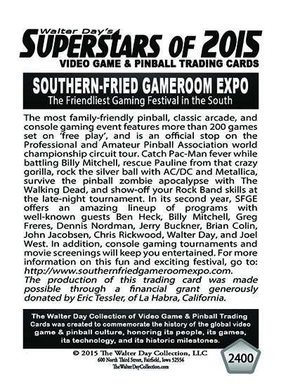 The award for this card was preented at the Southern Fried Gameroom Expo in Atlanta, GA, but the card was printed and issued at the Twin Galaxies Entertainment festival, October 3, 2015, in Banning, CA. The card was sponsored by Eric Tessler, of La Habra, California.
