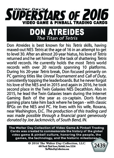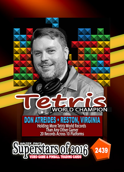 As the world record holder on Tetris, Don Atreides has been selected to be one of the featured Twin Galaxies Superstars in this game-specific "High-Score Champions" series of trading cards. This series of trading cards has been reserved only for World Champions whose high scores have been verified by the Twin Galaxies Scoreboard.