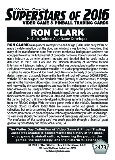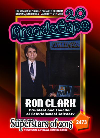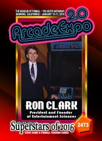 Card #2473, featuring Ron Clark -- the founder of Entertainment Sciences -- was presented (along with an award) at the Arcade Expo 2.0 Trading Card Award Ceremonies, at John Week's amazing Museum of Pinball, in Banning, California, January 16, 2016.