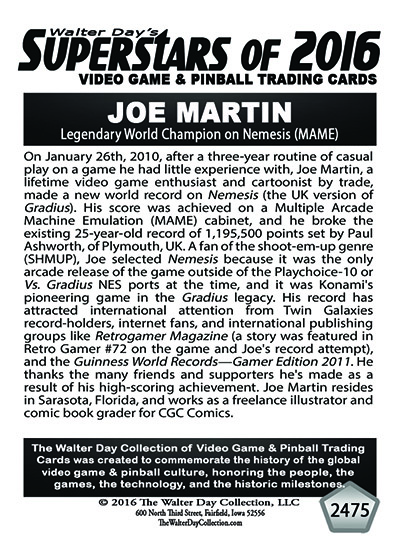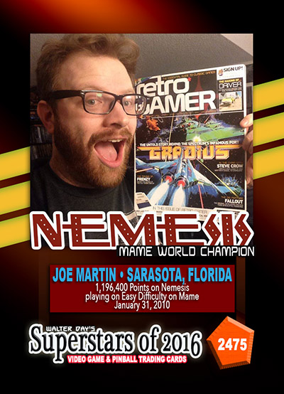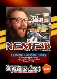 As the world record holder on Nemeis, Joe Martin has been selected to be one of the featured Twin Galaxies Superstars in this game-specific "High-Score Champions" series of trading cards. This series of trading cards has been reserved only for World Champions whose high scores have been verified by the Twin Galaxies Scoreboard.