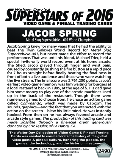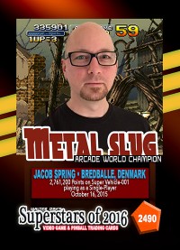 As the world record holder on Metal Slug, Jacob Spring has been selected to be one of the featured Twin Galaxies Superstars in this game-specific "High-Score Champions" series of trading cards. This series of trading cards has been reserved only for World Champions whose high scores have been verified by the Twin Galaxies Scoreboard.