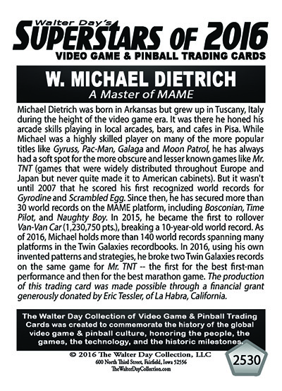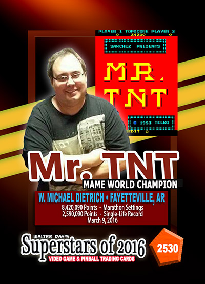 Other Notes: As the world record holder on Mr. TNT, W. Michael Dietrich has been selected to be one of the featured Twin Galaxies Superstars in this game-specific "High-Score Champions" series of trading cards. This series of trading cards has been reserved only for World Champions whose high scores have been verified by the Twin Galaxies Scoreboard.