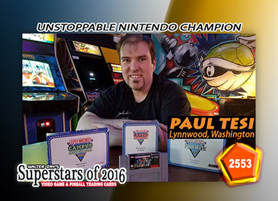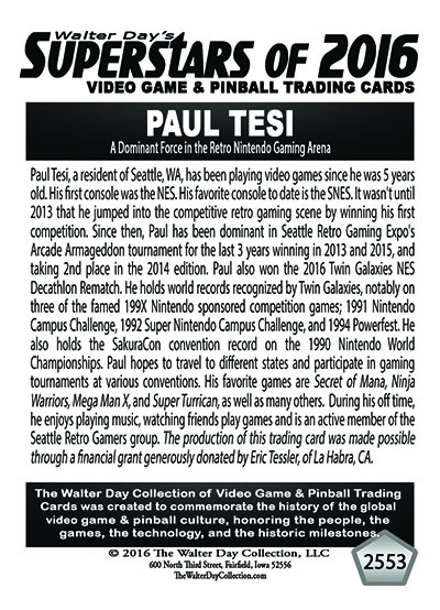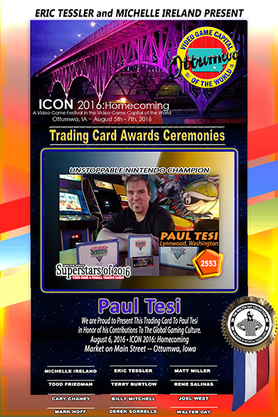 As a legendary competitor in the Nintendo universe, Paul Tesi's career was commemorated on this trading card and award, which were unveiled at the ICON: Homecoming event held in Ottumwa, Iowa, August 6, 2016.