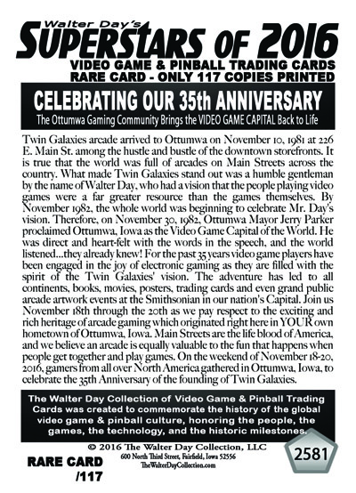 Other Notes: Unveiled at Twin Galaxies' 35th Anniversary, November 18-20, 2016. Commissioned by Jerry Byrum. and printed as a limited run of only 117 cards with a hand-written registration number on thew lower backside. Distributed at the event. Collectors may be able to obtain a copy by contacting Billy Hoffman, Jr. (in Ottumwa) and Jerry Byrum (in Ankeny, IA).