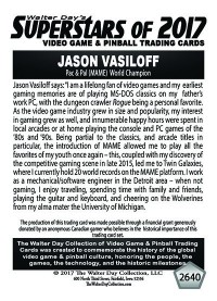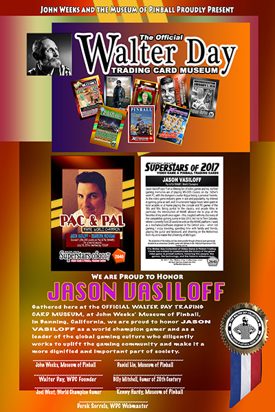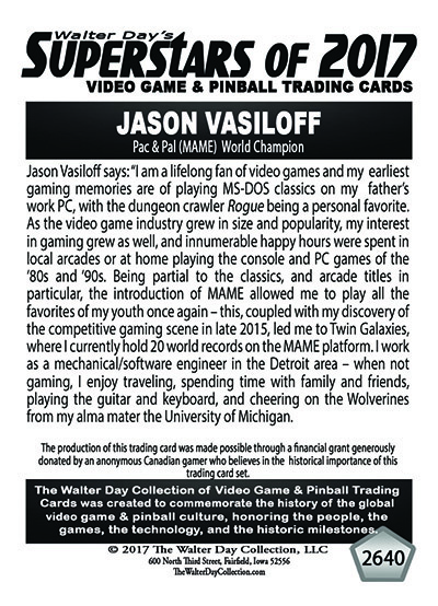 Card #2640 honoring Jason Vasiloff was unveiled on March 18, 2017 during the ARCADE EXPO 3.0 gaming exposition at John Weeks' Museum of Pinball, in Banning, California.