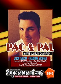 As the world record holder on Pac & Pal, Jason Vasiloff has been selected to be one of the featured Twin Galaxies Superstars in this game-specific "High-Score Champions" series of trading cards. This series of trading cards has been reserved only for World Champions whose high scores have been verified by the Twin Galaxies Scoreboard.