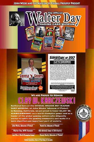 As part of the CLASS OF 2017, Clay Karczewski was inducted into THE OFFICIAL WALTER DAY TRADING CARD MUSEUM along with 14 other honorees. Here is the award that was presented at that time. The production of this trading card was made possible through a financial grant generously donated by an anonymous Canadian gamer who believes in the historical importance of this trading card set.Card #2645 honoring Clay W. Karczewski is to be unveiled on March 18, 2017 during the ARCADE EXPO 3.0 gaming exposition at John Weeks' Museum of Pinball, in Banning, California.