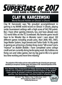 Card #2645 honoring Clay Karczewski was unveiled on March 18, 2017 during the ARCADE EXPO 3.0 gaming exposition at John Weeks' Museum of Pinball, in Banning, California.