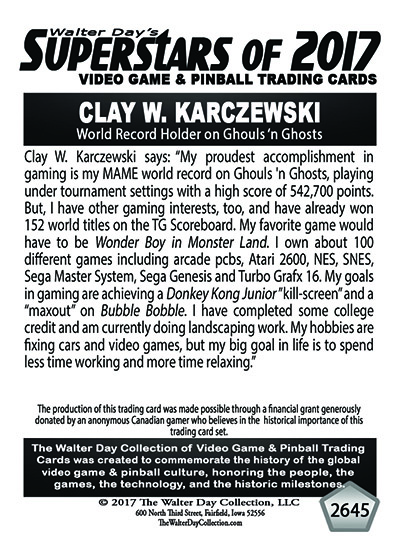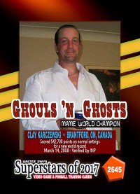 As the world record holder on Ghouls 'n Ghosts, Clay Karczewski has been selected to be one of the featured Twin Galaxies Superstars in this game-specific "High-Score Champions" series of trading cards. This series of trading cards has been reserved only for World Champions whose high scores have been verified by the Twin Galaxies Scoreboard.