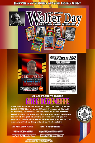 As part of the CLASS OF 2017, Greg Degeneffe was inducted into THE OFFICIAL WALTER DAY TRADING CARD MUSEUM along with 14 other honorees. Here is the award that was presented at that time. The production of this trading card was made possible through a financial grant generously donated by an anonymous Canadian gamer who believes in the historical importance of this trading card set.Card #2647 honoring Greg Degeneffe is to be unveiled on March 18, 2017 during the ARCADE EXPO 3.0 gaming exposition at John Weeks' Museum of Pinball, in Banning, California.