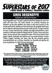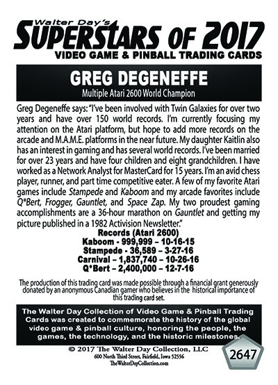 Card #2647 honoring Greg Degeneffe was unveiled on March 18, 2017 during the ARCADE EXPO 3.0 gaming exposition at John Weeks' Museum of Pinball, in Banning, California.