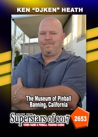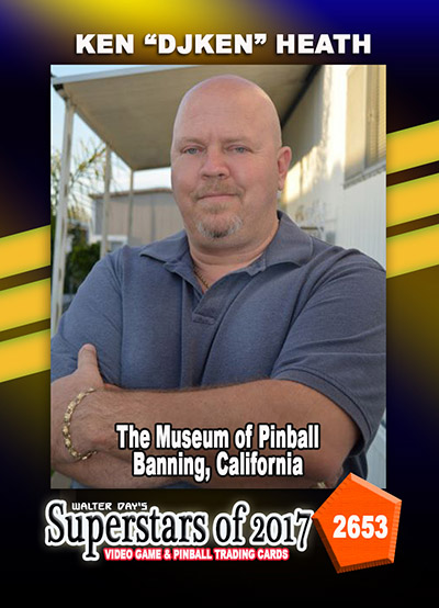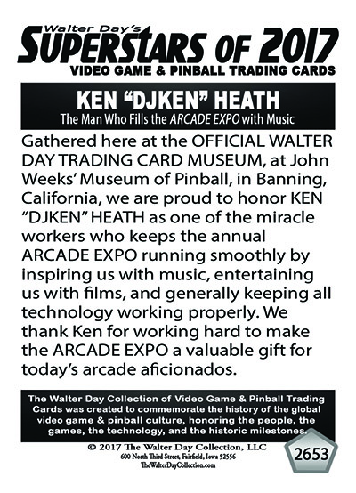 Gathered here at the OFFICIAL WALTER DAY TRADING CARD MUSEUM, at John Weeks’ Museum of Pinball, in Banning, California, we are proud to honor KEN “DJKEN” HEATH as one of the miracle workers who keeps the annual ARCADE EXPO running smoothly by inspiring us with music, entertaining us with films, and generally keeping all technology working properly. We thank Ken for working hard to make the ARCADE EXPO a valuable gift for today’s arcade aficionados.