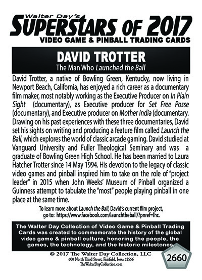 DAVID TROTTER • David Trotter, a native of Bowling Green, Kentucky, now living in Newport Beach, California, has enjoyed a rich career as a documentary film maker, most notably working as the Executive Producer on In Plain Sight (documentary), as Executive producer for Set Free Posse (documentary), and Executive producer on Mother India (documentary. Drawing on his past experiences with these three documentaries, David set his sights on writing and producing a feature film called Launch the Ball, which explores the world of classic arcade gaming. David studied at Vanguard University and Fuller Theological Seminary and was a graduate of Bowling Green High School. He has been married to Laura Hatcher Trotter since 14 May 1994. His devotion to the legacy of classic video games and pinball inspired him to take on the role of “project leader” in 2015 when John Weeks’ Museum of Pinball organized a Guinness attempt to tabulate the “most” people playing pinball in one place at the same time.