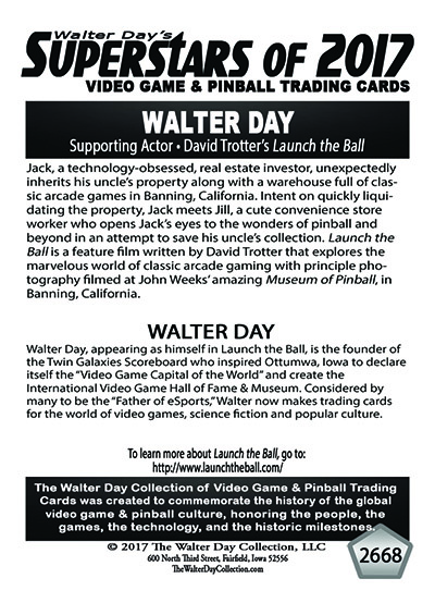 • Walter Day, appearing as himself in Launch the Ball, is the founder of the Twin Galaxies Scoreboard who inspired Ottumwa, Iowa to declare itself the “Video Game Capital of the World” and create the International Video Game Hall of Fame & Museum. Considered by many to be the “Father of eSports,” Walter now makes trading cards for the world of video games, science fiction and popular culture.