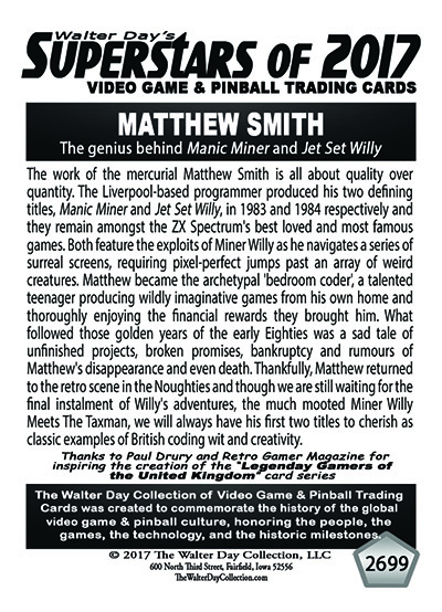 This award and card will most likely be presented a second time when the UNITED KINGDOM TRADING CARD CEREMONIES are held in 2018 at some to-be-announced location and date in Great Britain. Thanks to Paul Drury and Retro Gamer Magazine for inspiring the creation of the “Legenday Gamers of the United Kingdom” card series.
