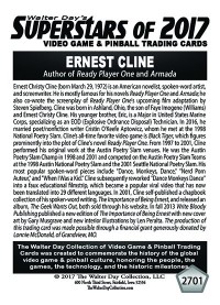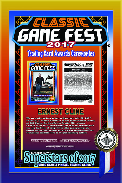 This trading card and award were presented to Ernie Cline during the Classic Game Fest Trading Card Awards Ceremonies, July 29, 2017, in Austin, Texas.
