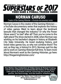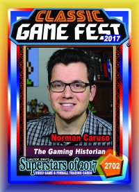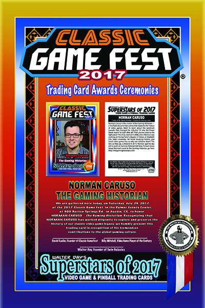 To honor Norman Caruso for his important contributions to the gaming culture, this trading card and award were presented at the Classic Game Fest Trading Card Awards Ceremonies, July 29, 2017, in Austin, Texas.
