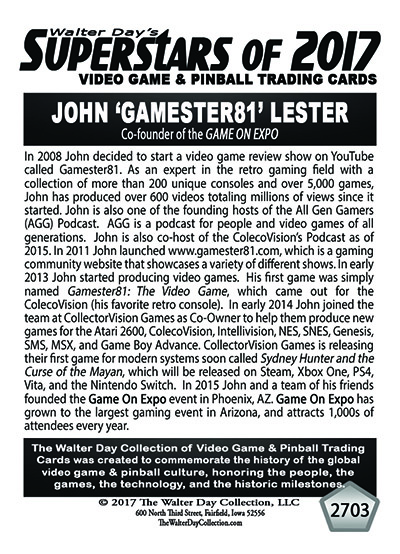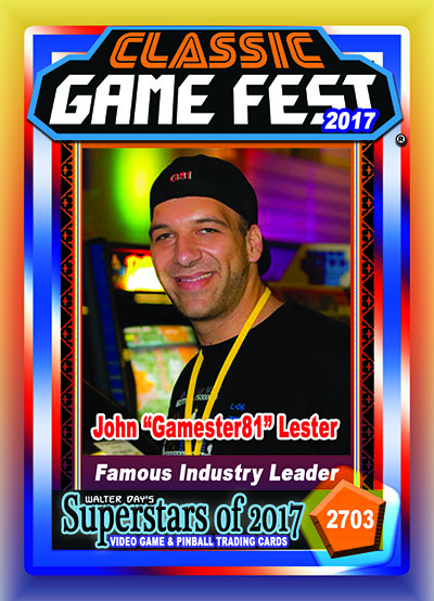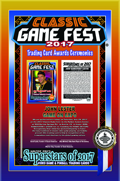 To honor John "Gamester81" Lester for his important contributions to the gaming culture, this trading card and award were presented at the Classic Game Fest Trading Card Awards Ceremonies, July 29, 2017, in Austin, Texas.