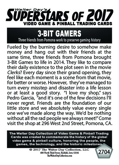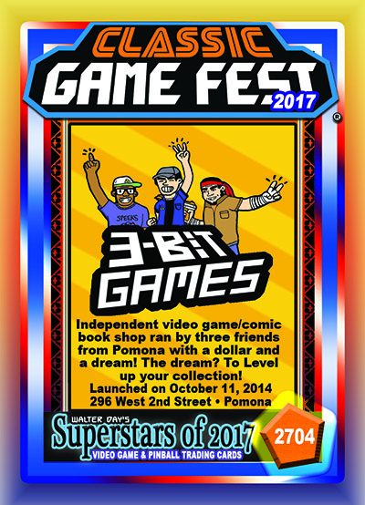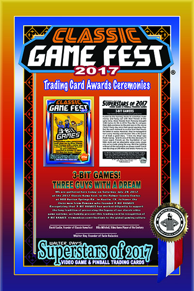 To honor 3-Bit Gaming for their important contributions to the gaming culture, this trading card and award were preesnted at the Classic Game Fest Trading Card Awards Ceremonies, July 29, 2017, in Austin, Texas.