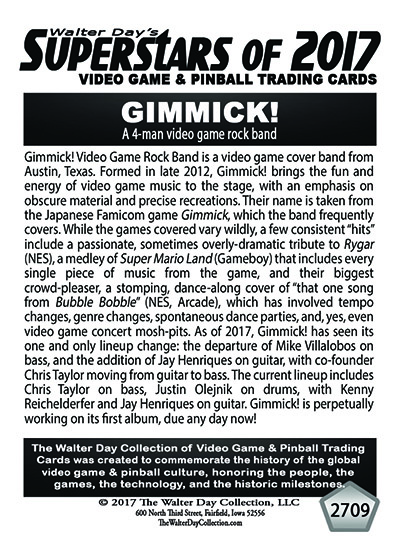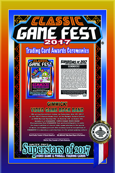 To honor the members of Gimmick for their important contributions to the gaming culture, this trading card and award were presented at the Classic Game Fest Trading Card Awards Ceremonies, July 29, 2017, in Austin, Texas.