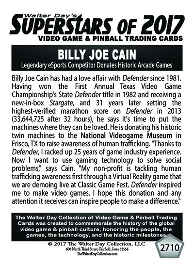 To honor Billy Joe Cain for his important contributions to the gaming culture, this trading card and award were presented at the Classic Game Fest Trading Card Awards Ceremonies, July 29, 2017, in Austin, Texas.
