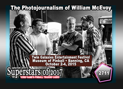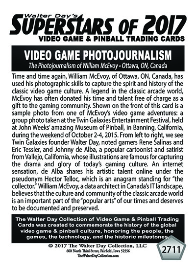 Time and time again, William McEvoy, of Ottawa, ON, Canada, has used his photographic skills to capture the spirit and history of the classic video game culture. A legend in the classic arcade world, McEvoy has often donated his time and talent free of charge as a gift to the gaming community. Shown on the front of this card is a sample photo from one of McEvoy’s video game adventures: a group photo taken at the Twin Galaxies Entertainment Festival, held at John Weeks’ amazing Museum of Pinball, in Banning, California, during the weekend of October 2-4, 2015. From left to right, we see Twin Galaxies founder Walter Day, noted gamers Rene Salinas and Eric Tessler, and Johnny de Alba, a popular cartoonist and satirist from Vallejo, California, whose illustrations are famous for capturing the drama and glory of today’s gaming culture. An internet sensation, de Alba shares his artistic talent online under the pseudonym Hector Telloc, which is an anagram standing for ”the collector.” William McEvoy, a data architect in Canada’s IT landscape, believes that the culture and community of the classic arcade world is an important part of the “popular arts” of our times and deserves to be documented and preserved.